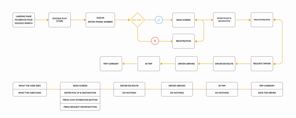 User Flows: After completing competitive analysis and user research insights, I translated findings into simplified user flows prioritizing speed and trust-building for Algeria’s first-time ride-hailing users.